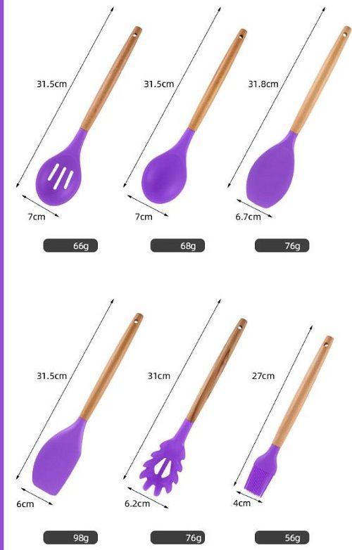 Packing list : 1 * Spoon1 * Soup Spoon1 * Turner1 * Slotted Turner1 * Scraper1* Pasta Server1 * Slotted Spoon1 * Brush1 * Spatula1 * Egg Beater1 * Food Tongs1 * Stoage Bucket
