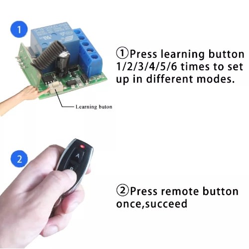 Working modes:1) Toggle/Self-Lock: Press- & gt;On; Press again- & gt;OffPressing one button for one time is working/ON Press the same button again is stop/OFF.2)Momentary/Jog: Press and hold- & gt;On; Release- & gt;OffKeep pressing one button that is working /ON. loosen your finger is stop/OFF.3) Latched/Inter-Lock: Press- & gt;On; Press other button- & gt;OffPress one button is working/ON, press another button is stop/OFF.Work model Set:(learn controller key choice model1. Self-lock/Toggle: P1 to ON, P2 not to ON2.Jog/(momentary): P1 P2 All not to ON3. Inter-lock /Latched: P2 to ON, P1 not to ON