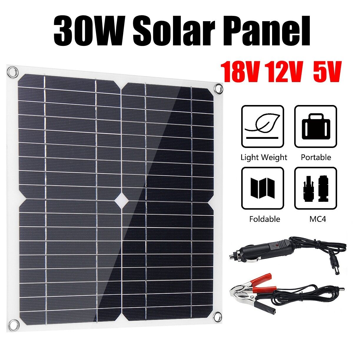 30W 18V Mono Solar Panel Dual USB 12V/5V Monocrystalline Flexible Solar Charger For Car RV Boat ChargerFeatures:1.Equipped with 12V DC5.5x2.1 5V USB output interface.2.Dedicated for 12V and 5V device charging.3.EVA+PET at front panel, flexible, light-weight but durable.4.Mono-crystalline solar Cell with efficient up to 21%.5.4x eyelet and free 2x carabiners for mounting more conveniently.6.IP65 waterproof, suitable for outdoor using in light rain.7.Well package with sponge mat and corner protectors.