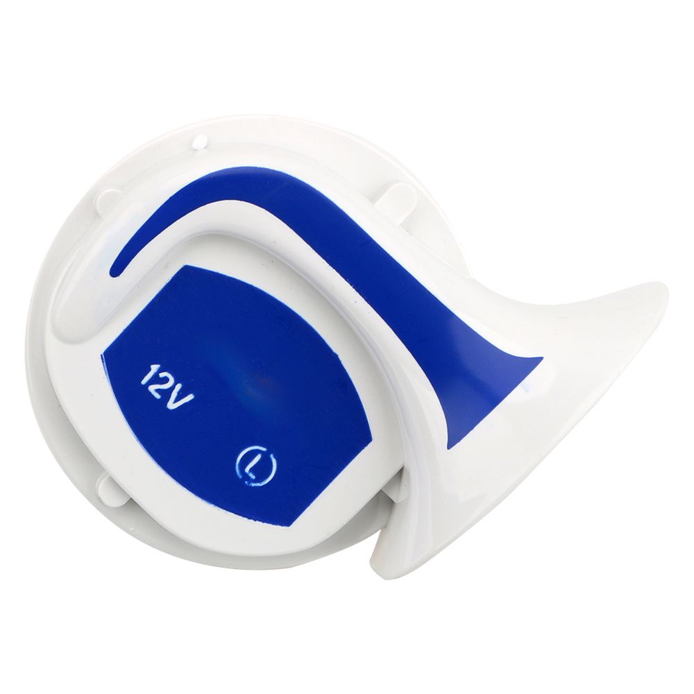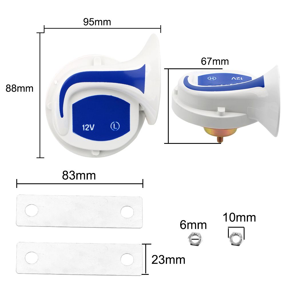 Easy install, durable Unique & fashion design, have different voices Please check the size carefully before you purchase. For use with any 12 volt vehicle(car, van,truck, SUV, motorcycle, yacht, boat, off Road vehicle etc) Material: ABS Colour: Blue Sound Level: 110 + 5 dB Voltage: 12V Frequency: Low 410Hz & high 510Hz
