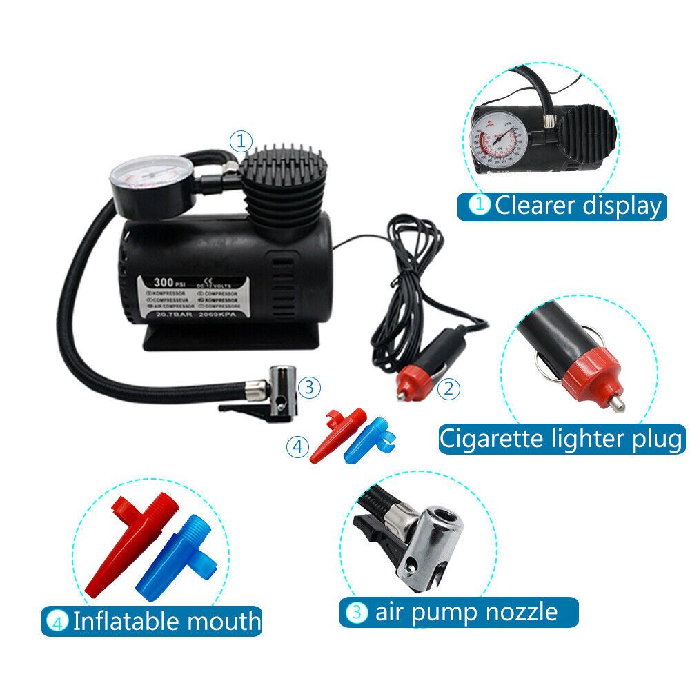 PrecautionsIf you insert the DC 12V car cigarette lighte*, you can use it too high, otherwise it will burn out. This small inflatable pump usually takes 8 minutes to fill the tire of the car tireDon't be in a hurry, don't think that you can't get inlet in less than 3 minutesLarge trucks, trucks, and big off -road cannot be inflated with this inflatable pump, (please do not try the consequences)