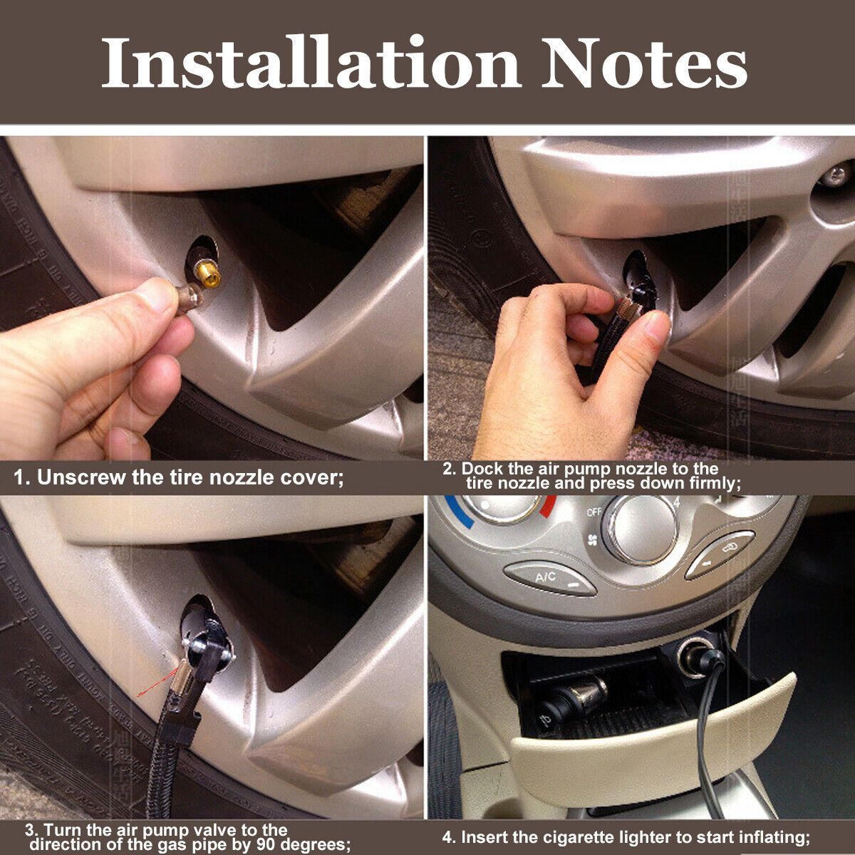 - Easy to use, simply plug your car cigarette lighte* into the power supply, cover the universal adapter on the tire valve and prepare for inflation