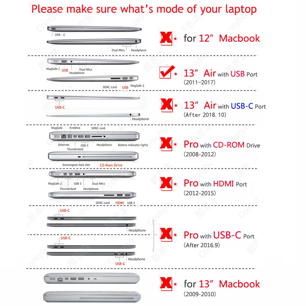 1.Specially designed for Apple Macbook 13" Air [USB Port],2011-2017 Air 13.3 inch(As shown).Model is A1466、A1369 on the bottom of laptop. Not suitable for other or similar model.