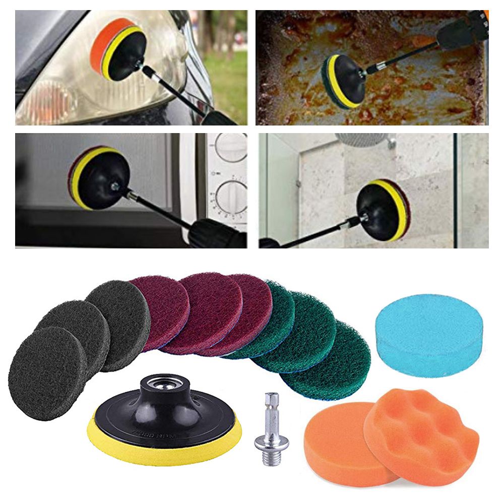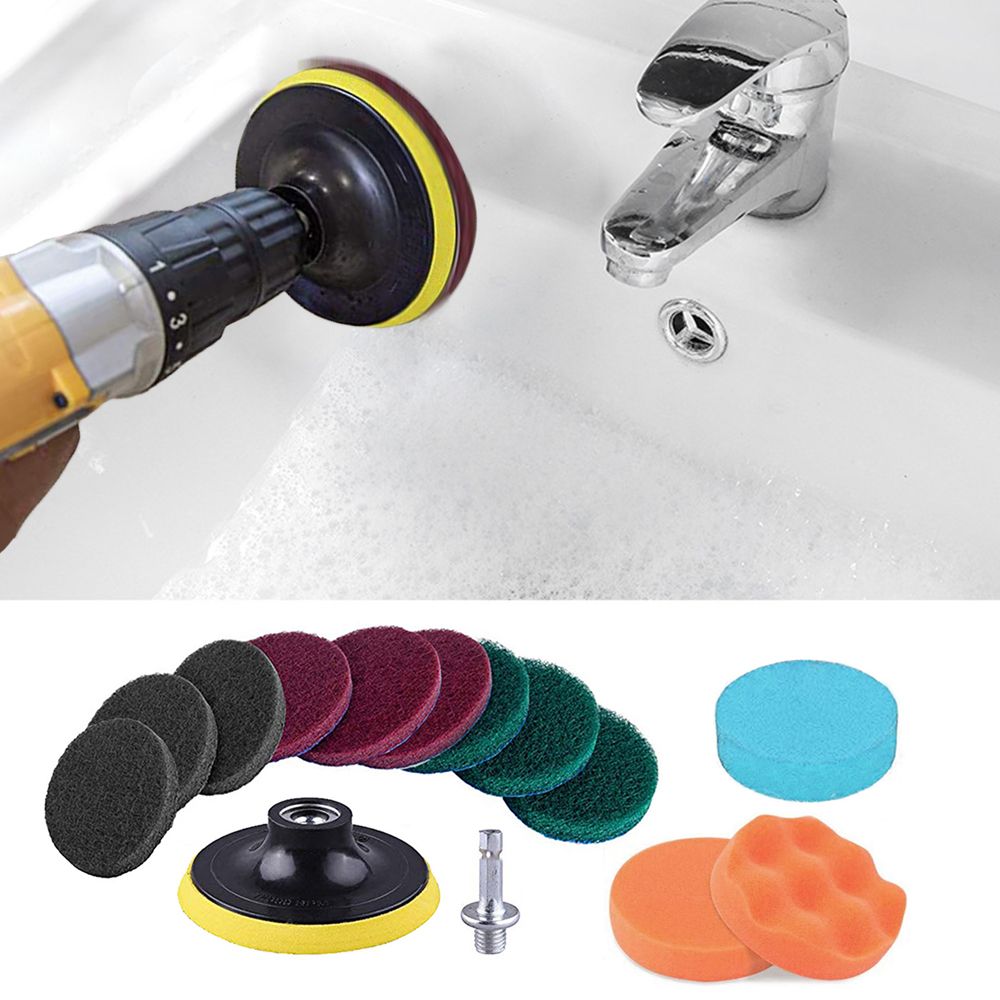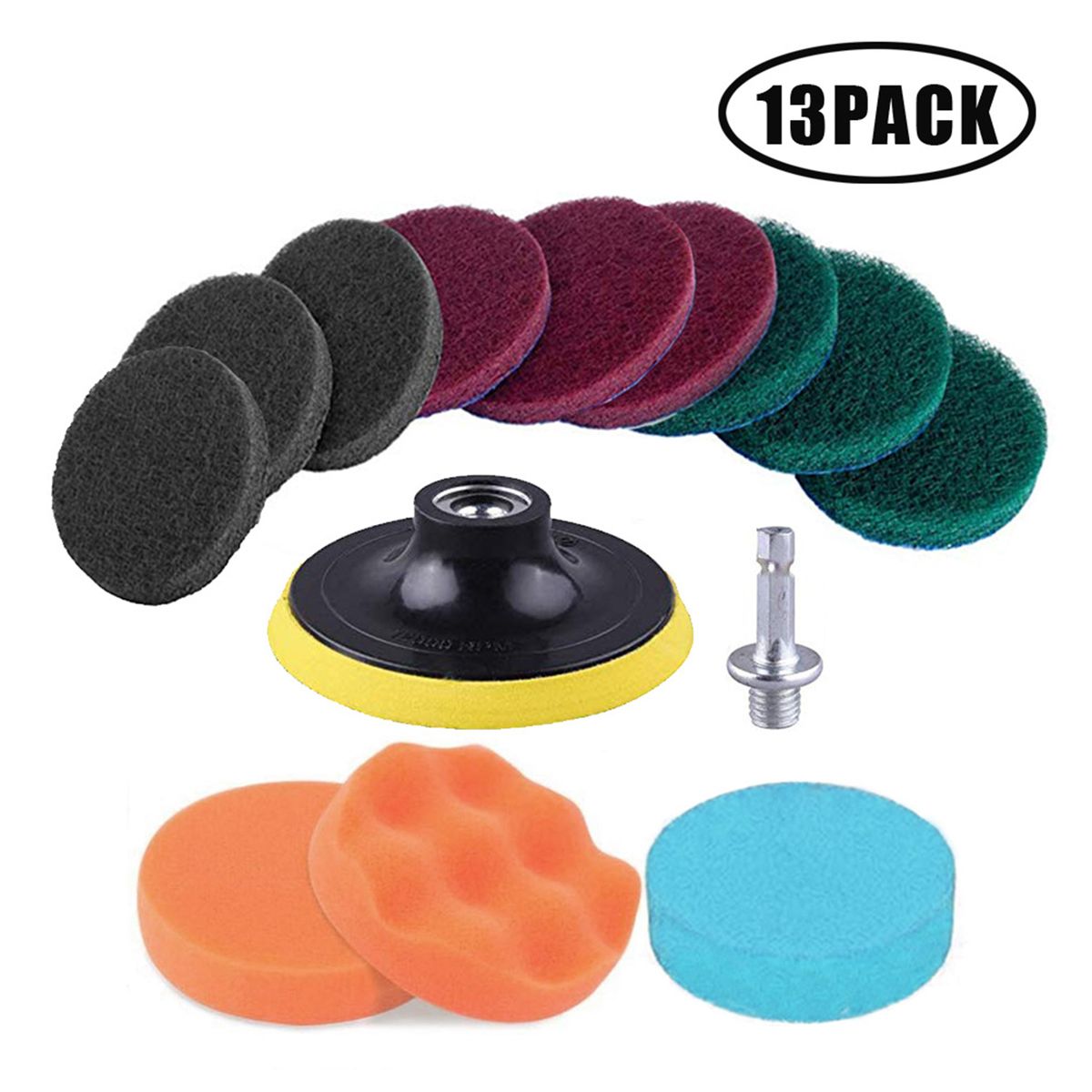 9 Pieces Drill Scrub Pad Attachments Kit: Includes 9 scrub pads (4in), 2 flat sponges (4in), 1 waved sponge (4in) and 1 self-adhesive discs (4in). Time-saving and labor-saving with power drill (not included).