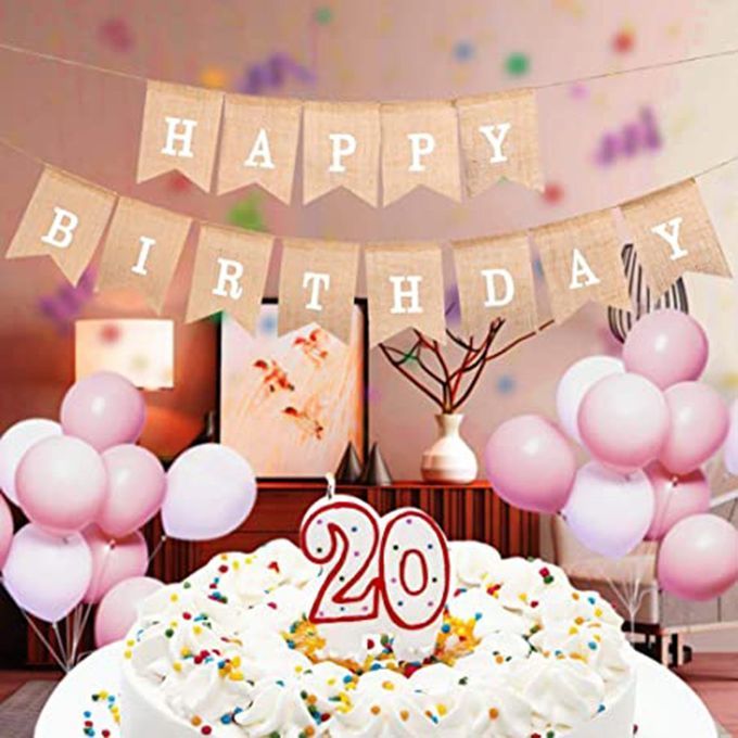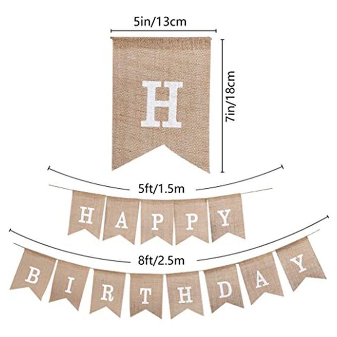 Spe ifi ations: olor: Linen Material: Linen loth, hemp rope spe ifi ation: HA Y (5 pie es), rope length 1.5m; BIRTHDAY (8 pie es), rope length 2m Single flag size: 13*18 m Net weight: 102g Style: White letter