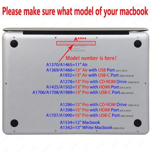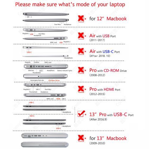 - 1.Specially designed for Apple Macbook 13" Pro [USB-C Port],after 2016 Pro with/without TouchBar 13.3 inch(As shown).Model is A1706、A1708、A1989 on the bottom of laptop. Not suitable for other or similar model.