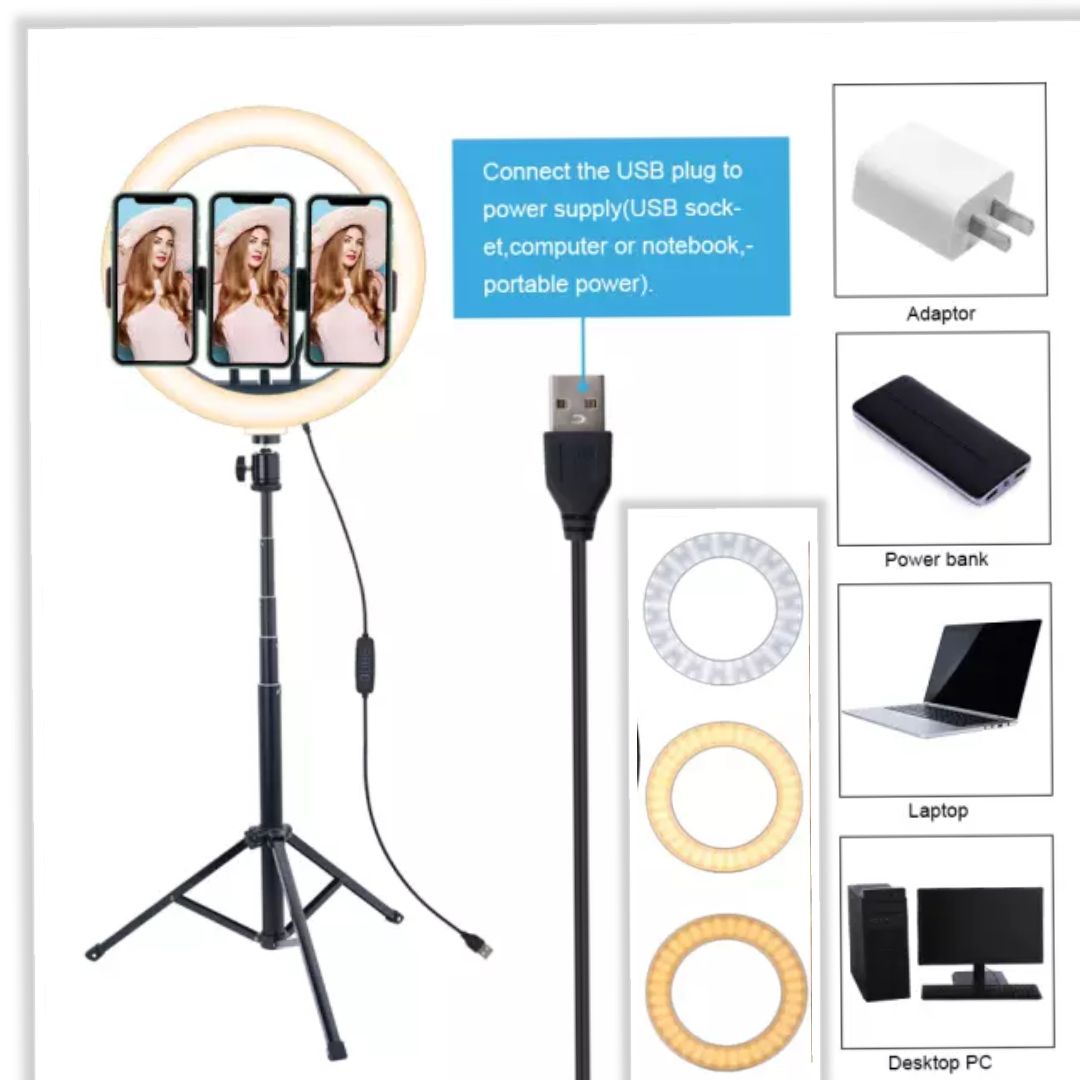 13” led ring light comes with tripod stand and a phone/camera holder.