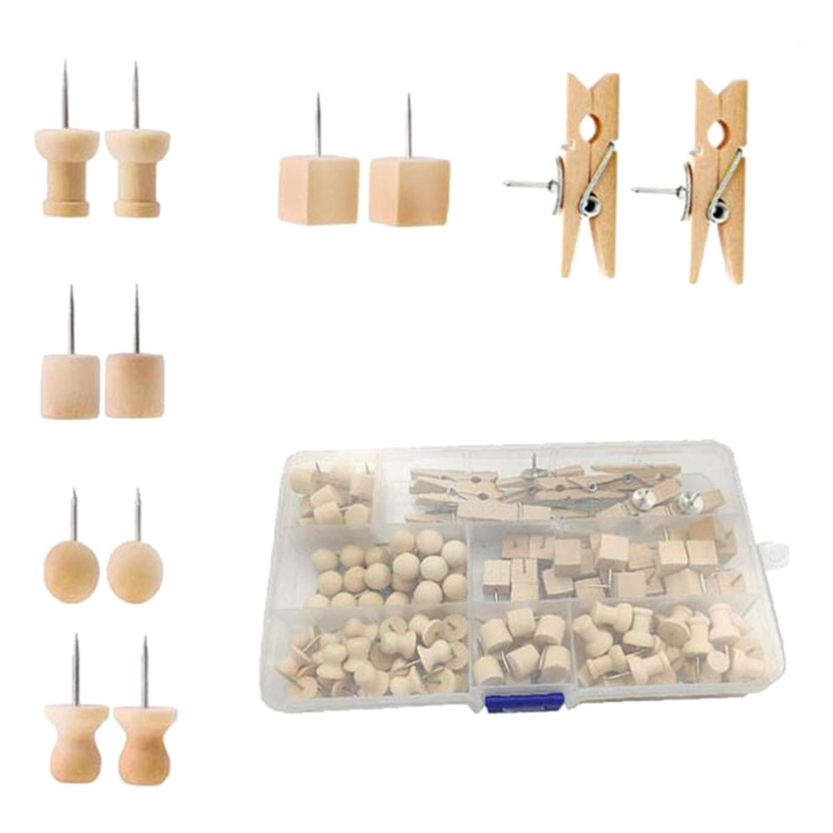 The wooden pushpin set includes 6 kinds of shape pushpins, 10 clip pushpins, 25 I-shaped pushpin, 25 herringbone pushpin, 25 round pushpin, 25 cylindrical pushpin, 25 square pushpin, a total of 135 pieces, can be used by classification .
