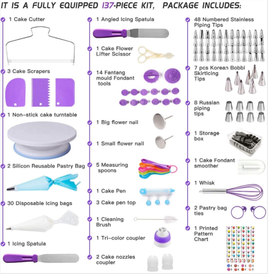1X 137PCs Stainless Steel Cake Tools Turntable Rotating Cake Stand/ Baking Supplies Cake Decorating Tips Set、Uses: DIY cake baking2、Material: plastic, stainless steel3、Easy to use, novices and veterans can meet your needs4、Suitable for cakes of various sizes, allowing you to decorate the cakes as you like.5、The material is environmentally friendly, safe and reliable, easy to clean and reusable.
