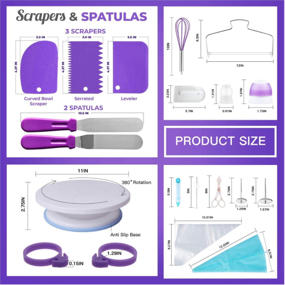 Notices:A. Due to the difference of mobile phone display and light, the actual color may be slightly different from the image.B. Due to manual measurement, please allow a measurement error of 1-3cm.C. The product itself is made of environmentally friendly materials, safe and comfortable to use, please rest assured to use it.D. Thank you for your understanding and welcome to buy our products.Material: plastic, stainless steel2、Uses: DIY cake baking3、Our cake making set providing you with all the tools you need for baking cakes.4、Suitable for cakes of all sizes and to help you decorate the cake perfectly.5、The material is green and environmentally friendly. The plastic and stainless steel are BPA free, safe and secure.