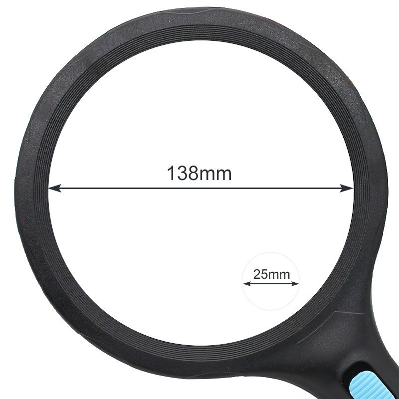 Dimension: 258x148x32 mm Weight/pc: 146 g Material: Acrylic, Eco-friendly plastic, LED Magnification: 1.8x, 5x Lens diameter: 138 mm, 25 mm Light: 12 white light LEDs Battery: 2 AA(Not included for safety!)