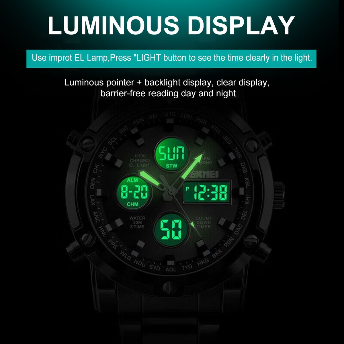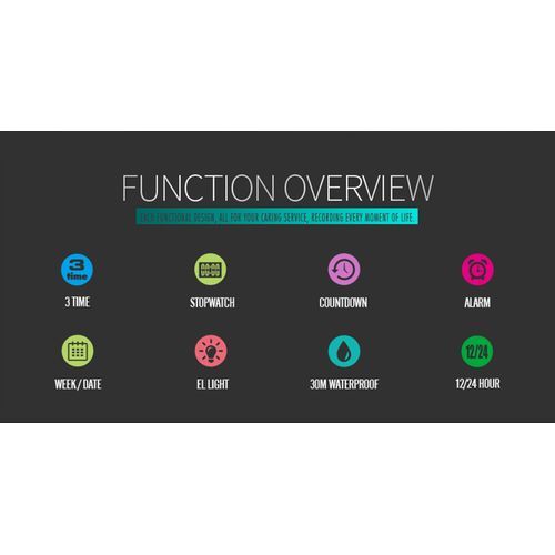 Three time, stopwatch timing, luminous, date display, regular alarm, week display, hour time, 12/24 hour system, hour time.