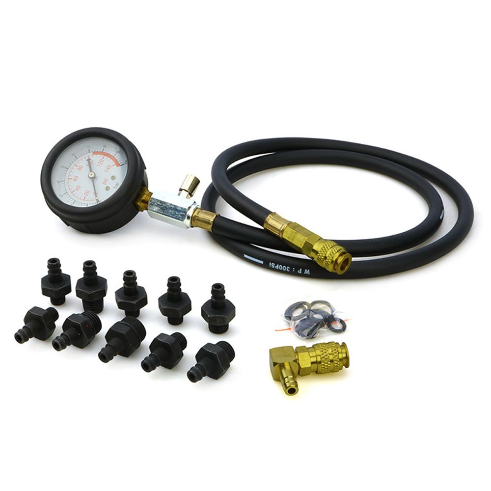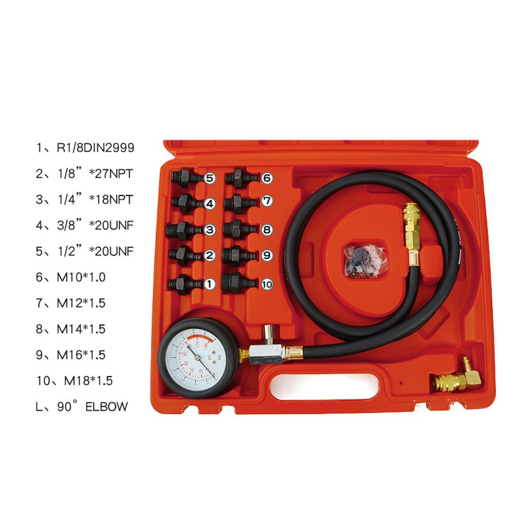 This car oil pressure test kit is adopts fine workmanship, easy installation, with high simplicity and long durability. Dual scale compression test gauge for diagnosing oil pressure in car, high temperature resistant, oil resistant surface for easy to read, suitable for most car models. The tube is designed with pure copper quick release fittings, with 90 degree quick release fittings for ease of use. The adapters are available in 10 different sizes and are suitable for a wide ranges of applications, used in gasoline engine car and motorcycle.