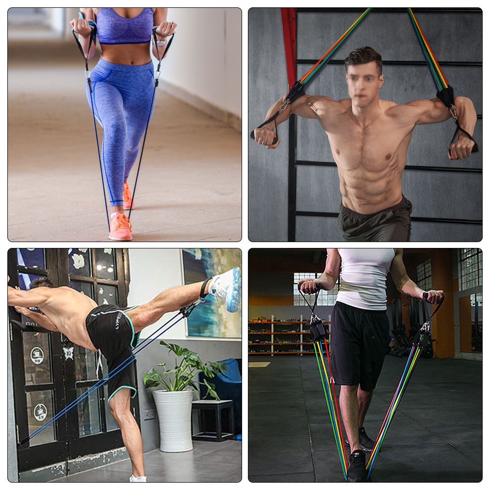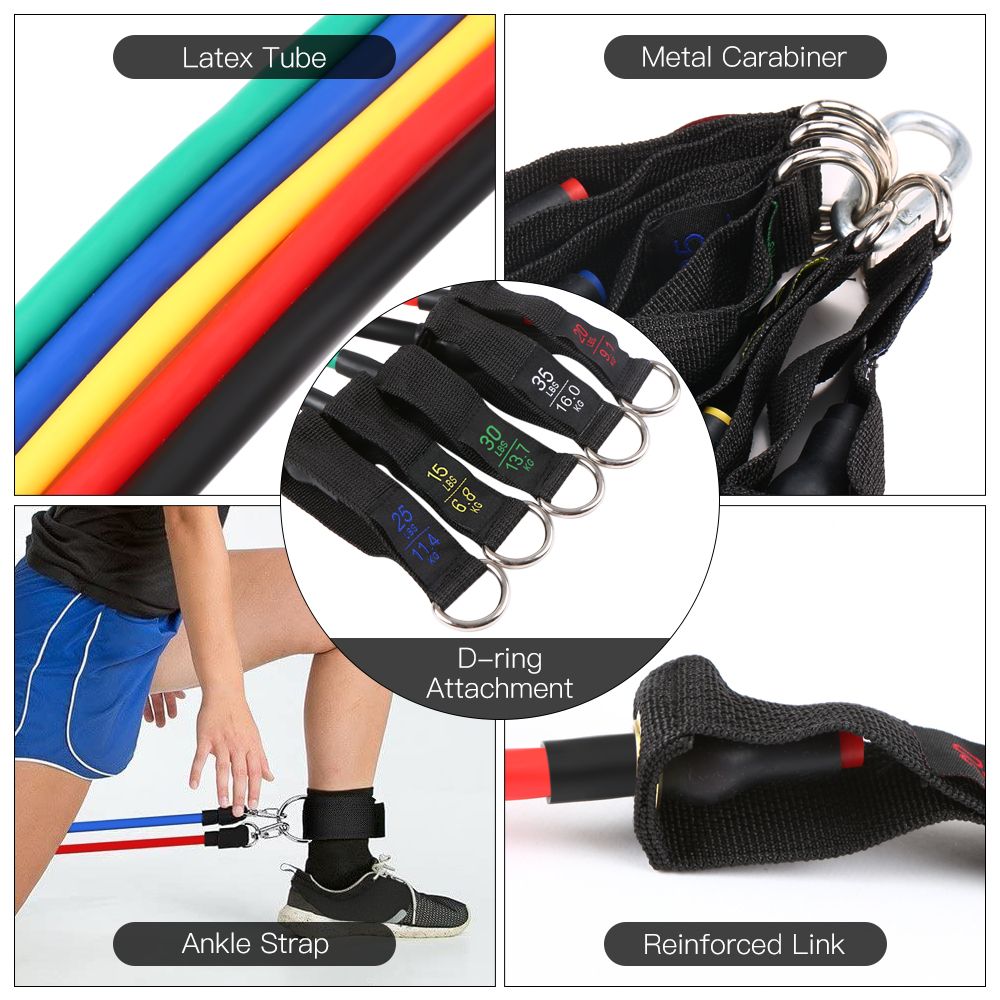 13pcs Fitness Bands Set: Includes 5 Resistance Tube Bands, 2 Cushioned Handles, 1 Door Anchor, 2 Ankle Straps, 2 Carabiner Hooks, 1 Carry Bags. With this complete workout kit, you'll never miss any chance to challenge various training difficulties for strength building and muscle toning.