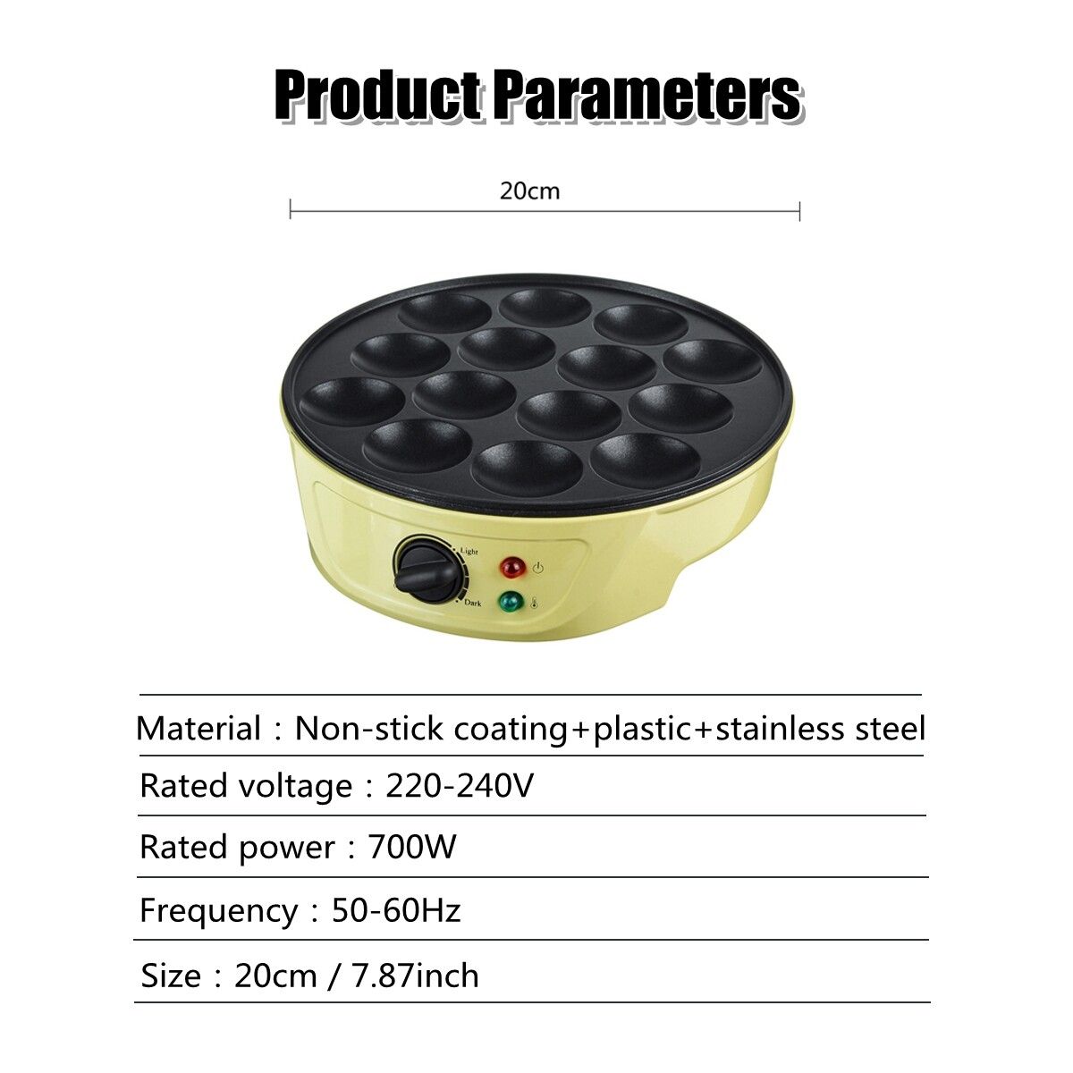 Multi-functional takoyaki machine household ball machine shrimp ball machineFeatures:-Food grade machine that is convenient for household use.-Adjustable temperature control switch.-Non-stick coating for easy cleaning.-Even heat distribution, cooking 14 perfect balls at a time.-Durable cookware that can last a long time if used with proper care. -The machine makes Takoyaki preparation both easy and fun.Specification:Material:Non-stick coating + plastic + stainless steelColor:YellowSize:20cm / 7.87inchRated voltage:220-240VRated :700WFrequency:50-60HzControl method:Temperature controllerApplicable number:2-3 peopleWeight:2.5kgPackage Included:1 *takoyaki machineNote:1.Please allow 0.5-1cm differences due to manual measurement.2.Due to the light and screen difference, the item's may be slightly different from the pictures.