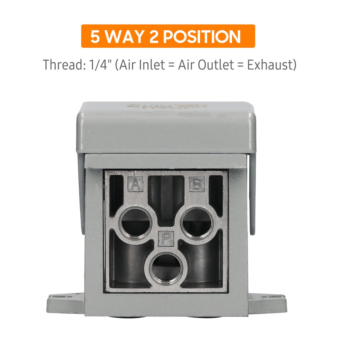Pneumatic foot pedal valve with 1/4-inch thread. 5 way 2 position. Direct drive acting type.