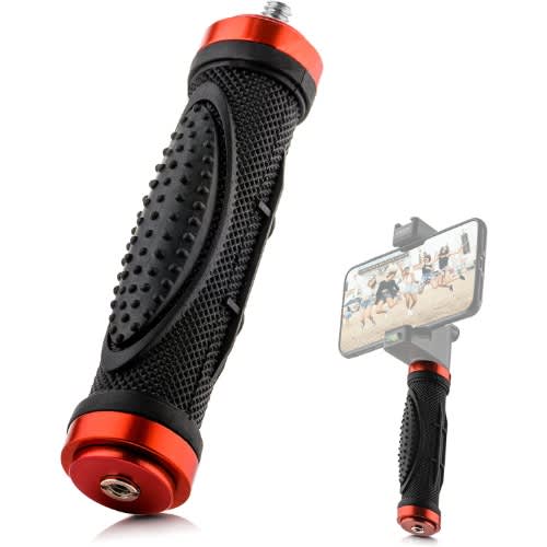 Features a shock-proof rubber handle that alleviates stress by offering a comfortable, secure grip.C-shaped design makes the device more practical and great for multi-angle filming.Soft foam grip adds comfort and eases the long shooting fatigue.Professional U-grip allows you to hold your camera or Smartphone down low when filming skiing, snowboarding, skateboarding, etc.With a sponge handle and non-slip feet, it is more stable.It can be used with most SLR cameras or camcorders.