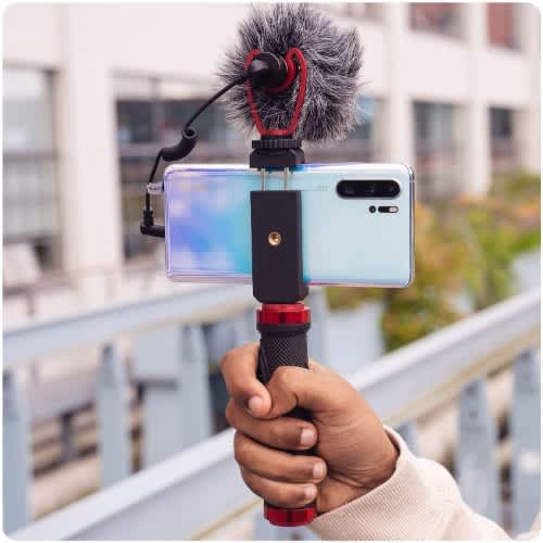 Vlogging kit is designed to enhanced your videos with better sound and lighting either indoor or outdoors, it includes a universal microphone, an LED light, a tripod grip, remote control and a smartphone adapter with built-in shoe