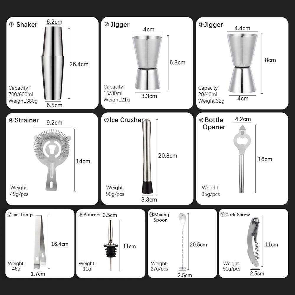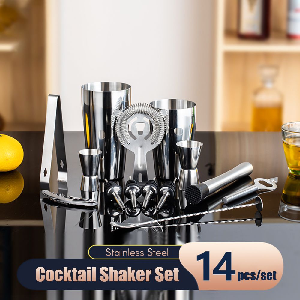 【Mixology Bartender Kit】14pcs/set, including 2 * shaker, 2 * double sided jigger, 4 * pourers, 1 * ice crusher, 1 * ice tongs, 1 * mixing spoon, 1 * strainer, 1 * bottle opener and 1 * cork screw, this mixology kit has everything you need to make craft cocktails.