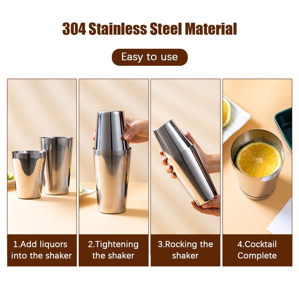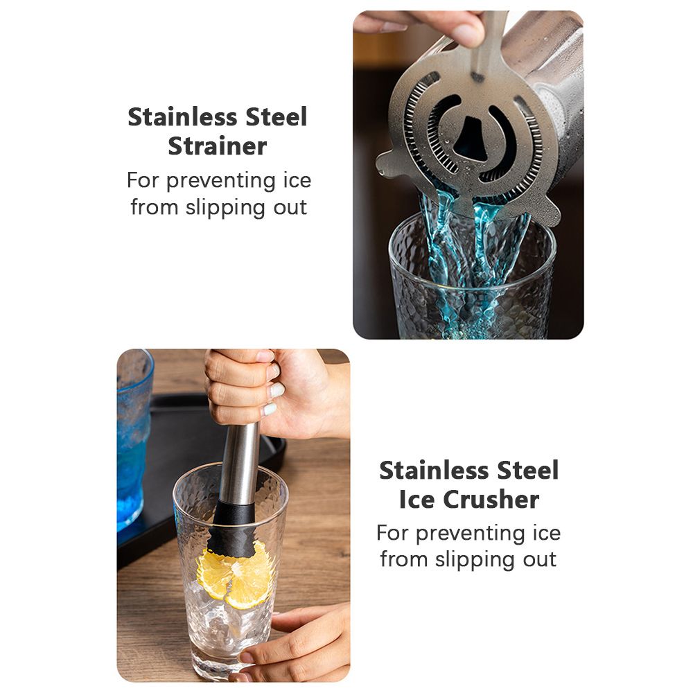 【Durable Stainless Steel Material】Mainly made of high-quality 304 stainless steel material and adopting polishing process, this cocktail shaker set not only looks fashionable and desirable, but has been professionally designed to last a lifetime.