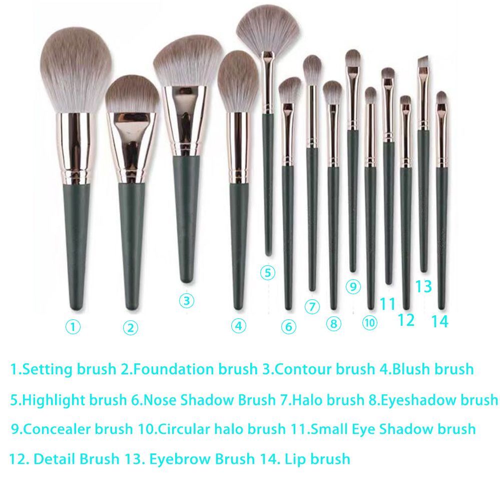 - Makeup brush type :1. Setting brush.2. Contour brush. 3. Blush brush. 4. Foundation brush. 5. Highlight Brush 6. Nose Shadow Brush 7. Smudge Brush 8.... Concealer Brush 9. Eyeshadow brush 10. Round Head Smudge Brush 11. Small eyeshadow brush 12. Detail brush 13. Eyebrow brush 14. Lip brush.