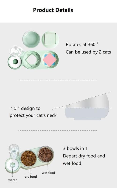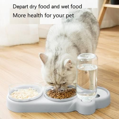Three in One, 15° Cat Bowl and Automatic Water Feeder Small Dog Food Container Depart Dry and Wet food or for Two Pets