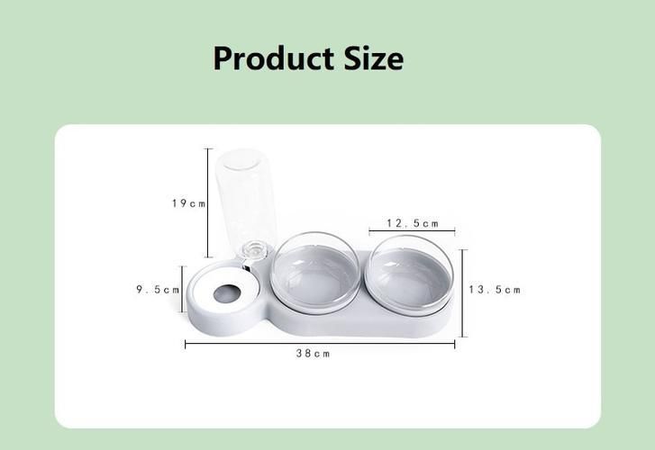 Product size: base 38*13.5cm, two food bowls diameters is 12.5cm, water tank diameter is 9.5cm, bottle is 19cm(500ml)