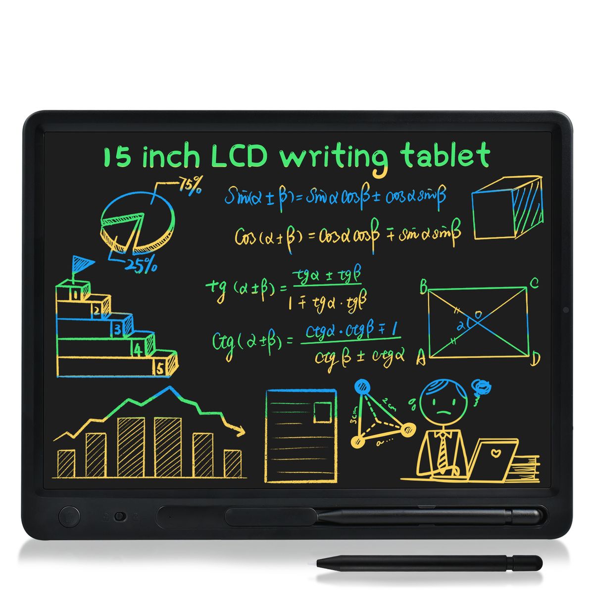 15 Inch Big Screen Wide Size LCD Writing Tablet Learning Pad Education Memo Board Adults Business Notebook Kids Drawing ToysSpecifications:Product Name: 15 Inch Handwriting BoardProduct model: ARS150NPressure output: 100-200gBattery model: CR2025Size: 233mm * 182mm * 8mmPanel: Flexible LCD panelMaterial: LCD; ABSNW: 260gGW: 440gFeatures:1. Eye Protection & Safe for Kids : The LCD writing tablet features the latest LCD pressure-sensitive technology. The screen of drawing board is completely safe via the test: no glare, no radiation,no ink, no dust, paper-like vision, which can protect your kids eyesight and keep them away from chemical pigments and dust that will stimulate their skin and lungs.2. Easy to use: Depending on how hard you use the stylus,LCD writing tablet will create lines of different thicknesses. You can draw lines on the LCD writing tablet with a stylus pen( we provide) or any other hard but not sharp material (such as spoons, nail, etc.). Pressing the delection key, everything will be delected immediately, and it is with the lock key design to avoid accidental delection, when the lock key on, will keep the entire picture unchanged , while when the lock key off the writings will be delected.3. Environmental & Economical: The built-in battery of the LCD writing tablet provides 12 months lifespan, which can be replaced for cycle use, without charging or plugging in power. and the LCD writing tablet is with low energy consumption design, only consume the power when using the delection function, while when you are writing things it wont consume the energy. The LCD writing tablet can be used for about 100,000 times writing and delecting, which can avoid the waste of paper and pencils, reducing expense and no more mess at home.4. Durable & Portable: The drawing tablet shell is made of durable premium quality plastic ABS, and the rounded corner design with excellent shock and drop resistance. The screen of writing board is hard to crack. and it is with lightweight and ultra thin design, which makes them easy to put in school bags, handbags,briefcase as well as travel bags. and the LCD writing tablet is applicable for multiple occasions such as group discussion, brainstorming,taking notes, making calculations, reminder, record the moment of inspiration and so on. besides it is suitable for all the ages.Packing list:1 * LCD writing board2 * Plastic pens1 * User Manual1 * Color box15 Inch Colorful Doodle Board Electronic LCD Writing Tool Clean Portable Tablet for Kids&Adult Learning Toys Gifts School&Office