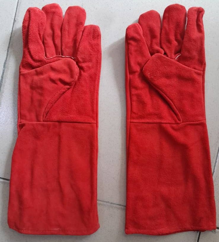 leather hand gloves. The hand glove is 15 inches in length and It is one-size-fits-all hand gloves. Unisex. Perfect for those heavy duty hand protection purposes. Two layers of well tanned contrast coloured leather combine where it's most needed - across the palm around the forefinger and across the thumb face to give tough yet supple support. Generously sized and superbly comfortable with a highly visible coloured back/safety cuff. Conforms to