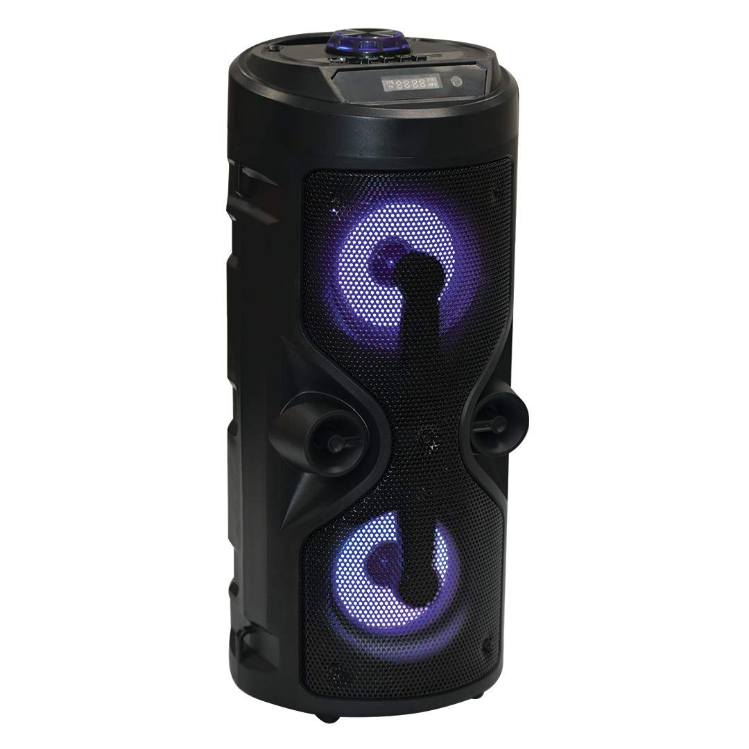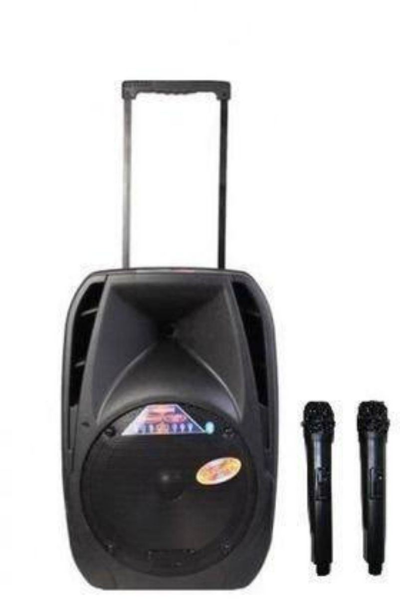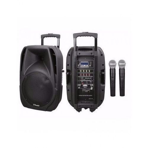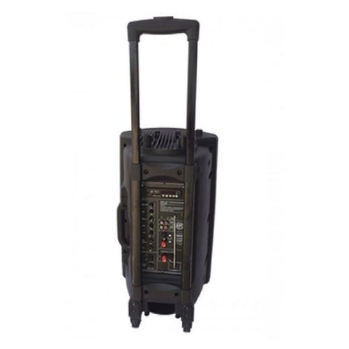 operating from mains or internal rechargeable battery powers a 15" bass driver and 1" compression driven. A pair of included VHF handheld wireless microphones work in conjunction with the internal receiver, two standard 'wired' microphones can also be plugged in giving the user a total of four microphones. Finally an auxiliary line input and integral USB/SD media player allow for direct reading of MP3s from USB or SD cards. iPods, Laptops, CD players can also be connected via the PAs RCA (line input) located on the rear of the unit. A moulded handle and pole mount are included and a retractable trolley handle and rear wheels provide easy portability.