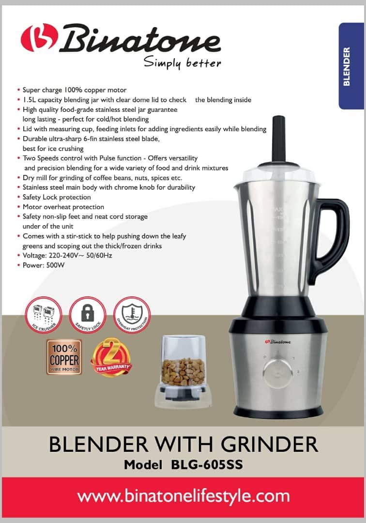 Elegantly designed, all Binatone blenders are equipped with 1.5 Litre capacity Jugs, Dry Mill Grinders & 2 Speed + Pulse modes. With power ranging from 500W,- Voltage of 220-240V- 50/60Hz. Binatone Glass Jar models are ideal for crushing ice, while models with unbreakable Polycarbonate (PC) Jars are perfect for routine domestic usage.
