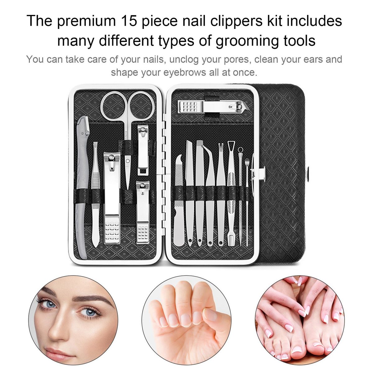 The premium 15 piece nail clippers kit includes many different types of grooming tools, so that you can take care of your nails, unclog your pores, clean your ears and shape your eyebrows all at once.