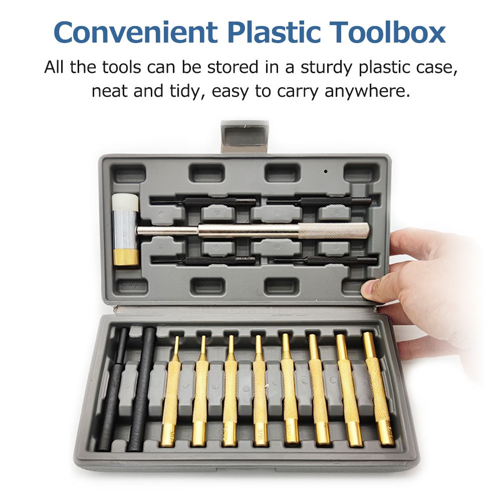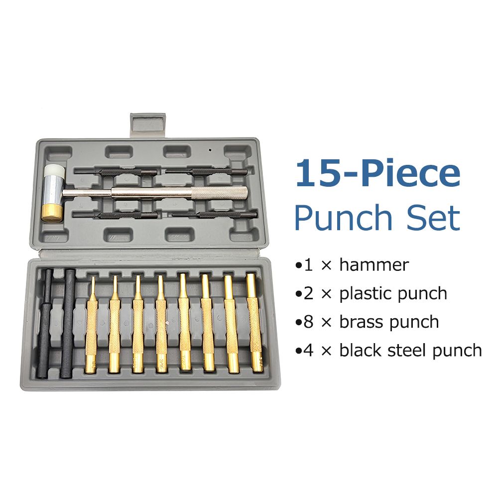15PCS Of One Set: it contains 1pcs two-sided hammer, 2pcs sturdy plastics punches, 8pcs hard brass punches, 4pcs wear-resistant black coating steel punches, enough for use.
