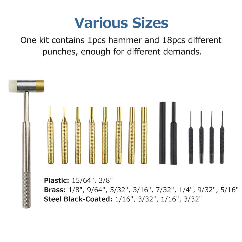 Various Sizes: 1/8, 9/64, 5/32, 3/16, 7/32, 1/4, 9/32, 5/16 inch (brass punches), 15/64, 3/8 inch (plastics punches), 1/16, 3/32, 1/16, 3/32 inch (steel punches), meet different needs.
