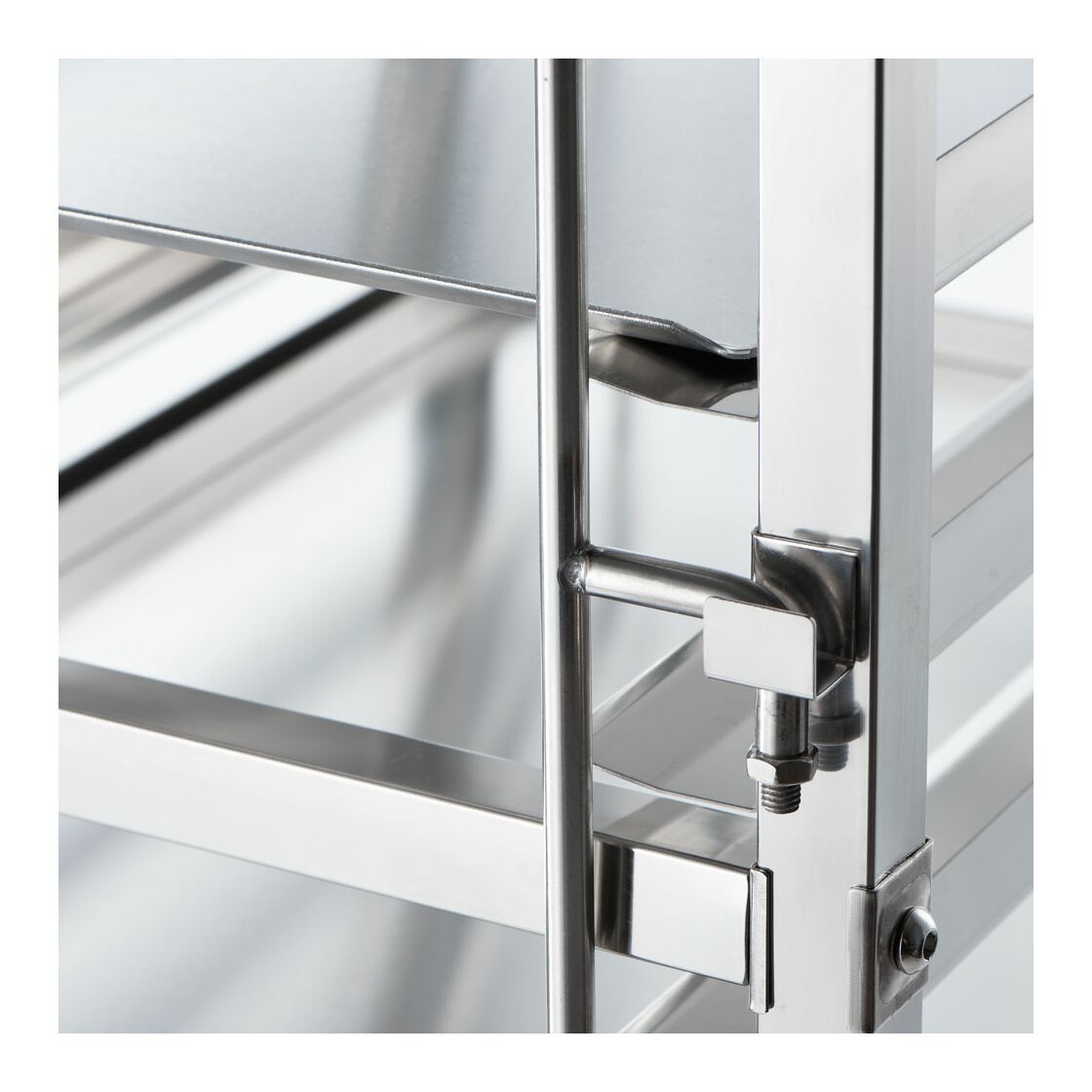 With stainless steel brackets on both sides for push-through and transport protection - four plastic castors, including two castors with locking brakes - distance between supports: 90 mm - suitable for 15 x trays 600 x 400 mm.