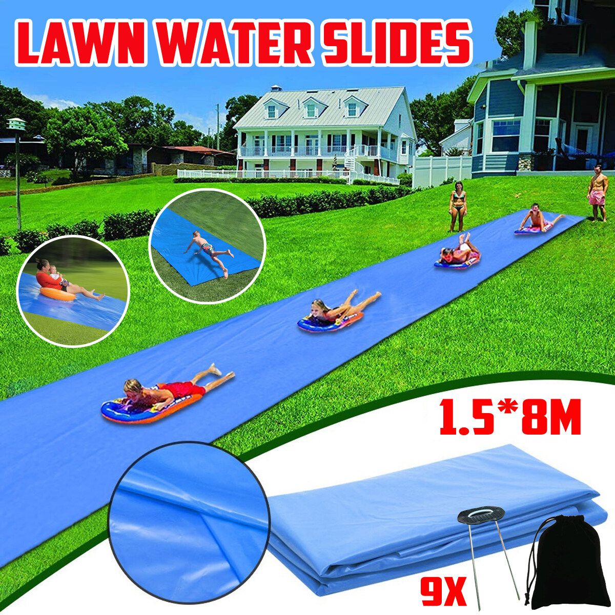 This super durable, mega sized, jumbo water slide measures a whopping 8M x 1.5M .Turn your back yard or event into a water park that you can easily set up on your lawn! It is recommended to pull a tap at the top to supply water continuously,If there is bath dew, the effect will be more perfect