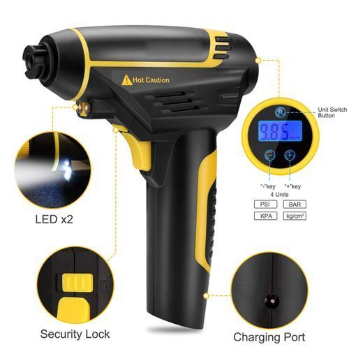 1) Portable Air Compressor - Built-in 2200mAh rechargeable battery, this powerful tire inflator air pump can inflate a flat tire in 8 minutes without any messy wires.