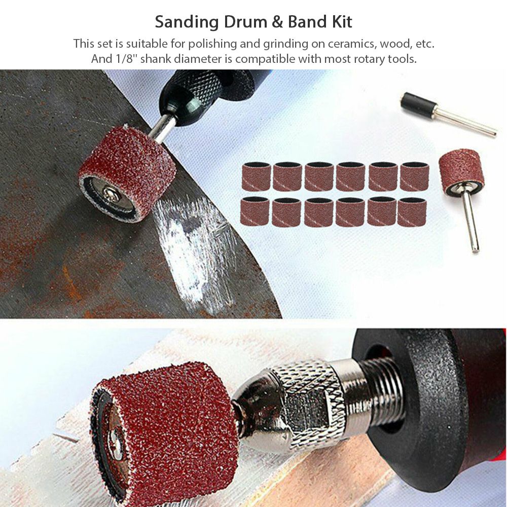Sanding band should use with sanding drum and this set is suitable for polishing and grinding on ceramics, wood, etc. And 1/8\'\' shank diameter is compatible with most rotary tools.