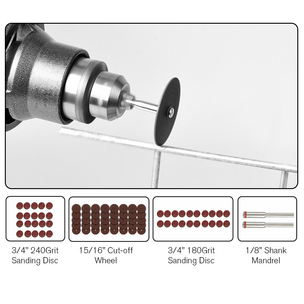 This set includes sanding discs, sand bands, brass wire brush wheels, plastic wire brush wheels, mandrels, sanding drums, cut-off wheels.