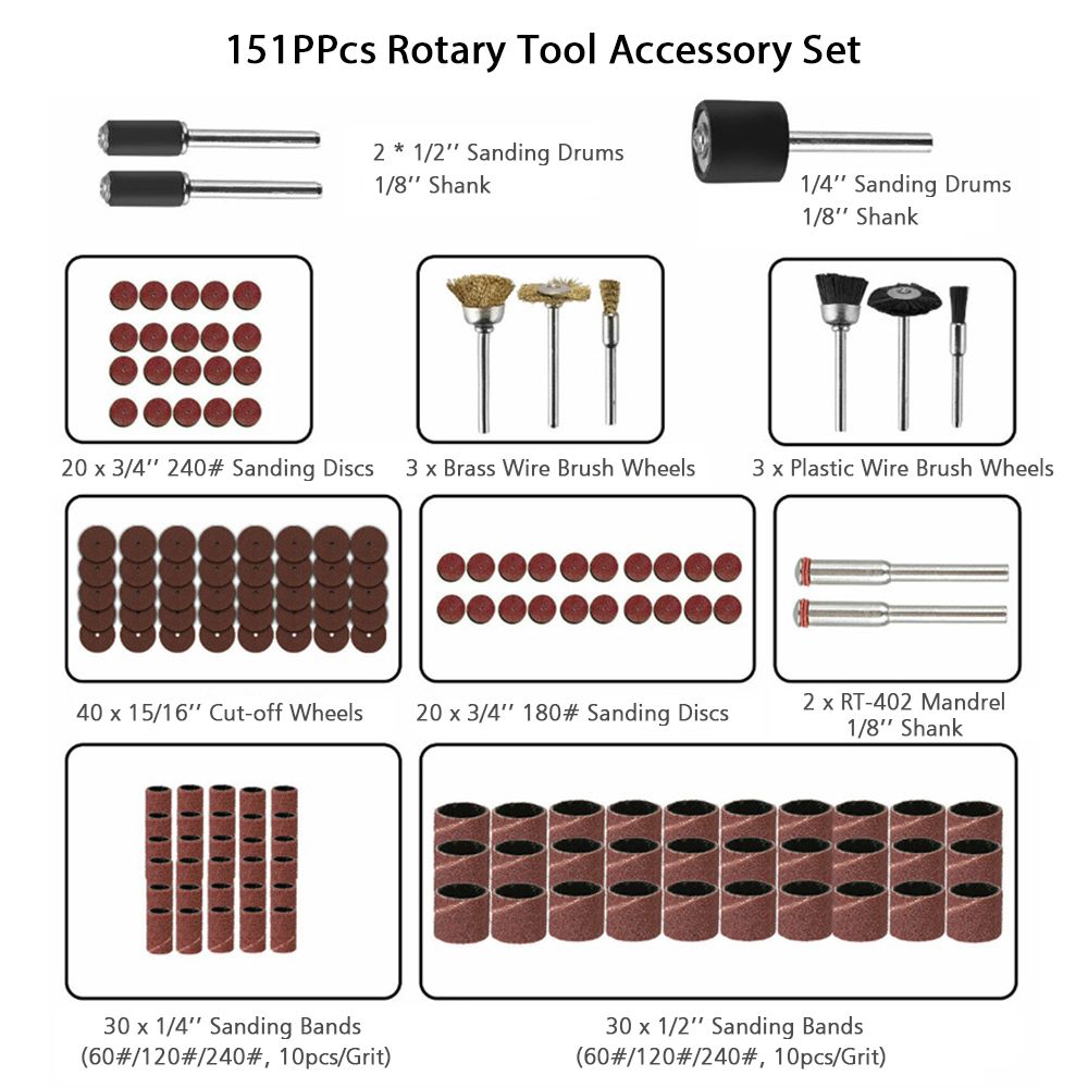Includes: Sanding discs, Sand bands, Brass wire brush wheels, Plastic wire brush wheels, Mandrels, Sanding drums, Cut-off wheels