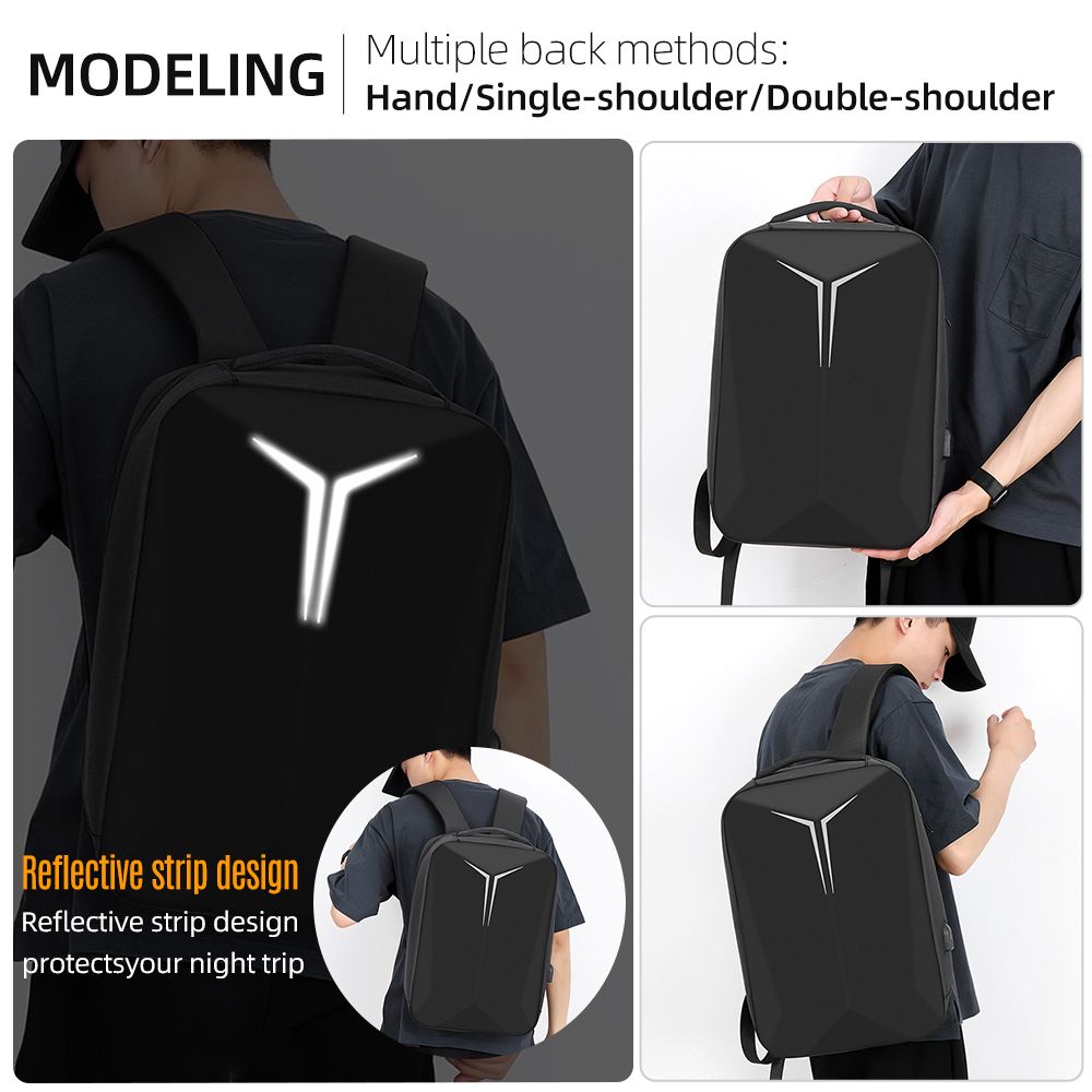 15.6 inch Large Capacity Hard Shell Backpack Waterproof Breathable Business Bag with Reflective Strip External USB Port Black