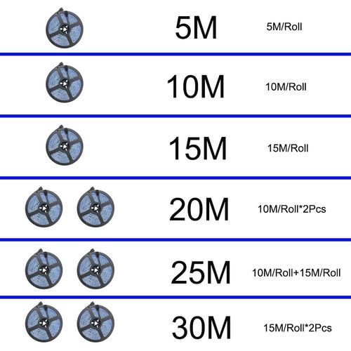 High intensity and reliability Low power consumption Super-bright but running with low temperature All the light spread and completely smooth 5000 hours span life ir remote can only remote 5m distance,but wifi remote can remote any distance as you need,you can control it by smartphone APP Package include: 5050 Full set 5m=1*5M/roll+1*IR/ Remote Controller (no battery)+1*DC12V Power Adapter 10m=1*10M/roll+1*IR/ Remote Controller (no battery)+1*DC12V Power Adapter 15m=1*15M/roll+1*IR/ Remote Controller (no battery)+1*DC12V Power Adapter 20m=2*10M/roll+1*IR/ Remote Controller (no battery)+1*DC12V Power Adapter 25m=1*10M/roll+1*15M/roll+1*IR/ Remote Controller (no battery)+1*DC12V Power Adapter 30m=2*15M/rol+1*IR/ Remote Controller (no battery)+1*DC12V Power Adapter