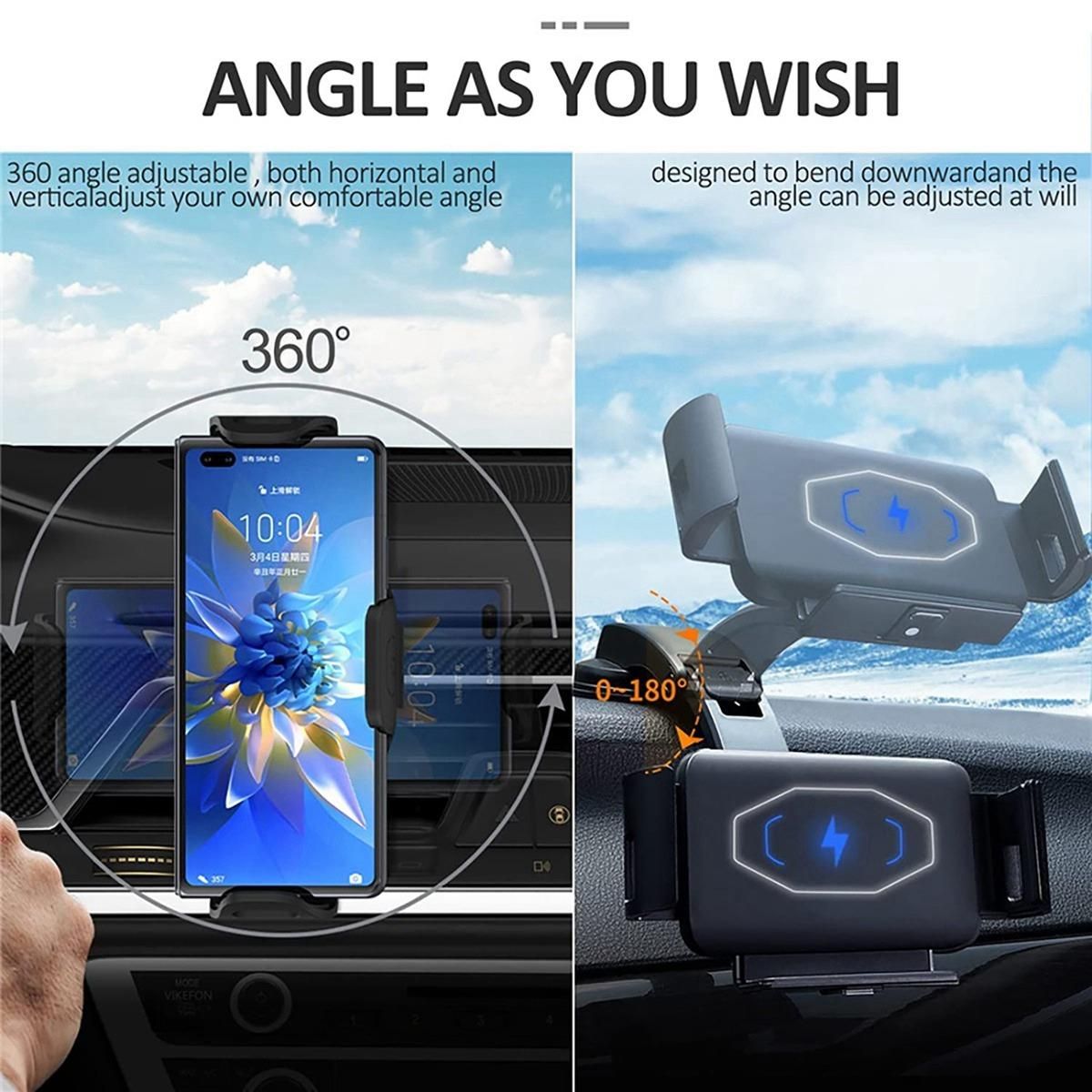 Adjustable angle and 360 degree rotatable. Works with any car USB charger of 2A or more(USB-C cable included)