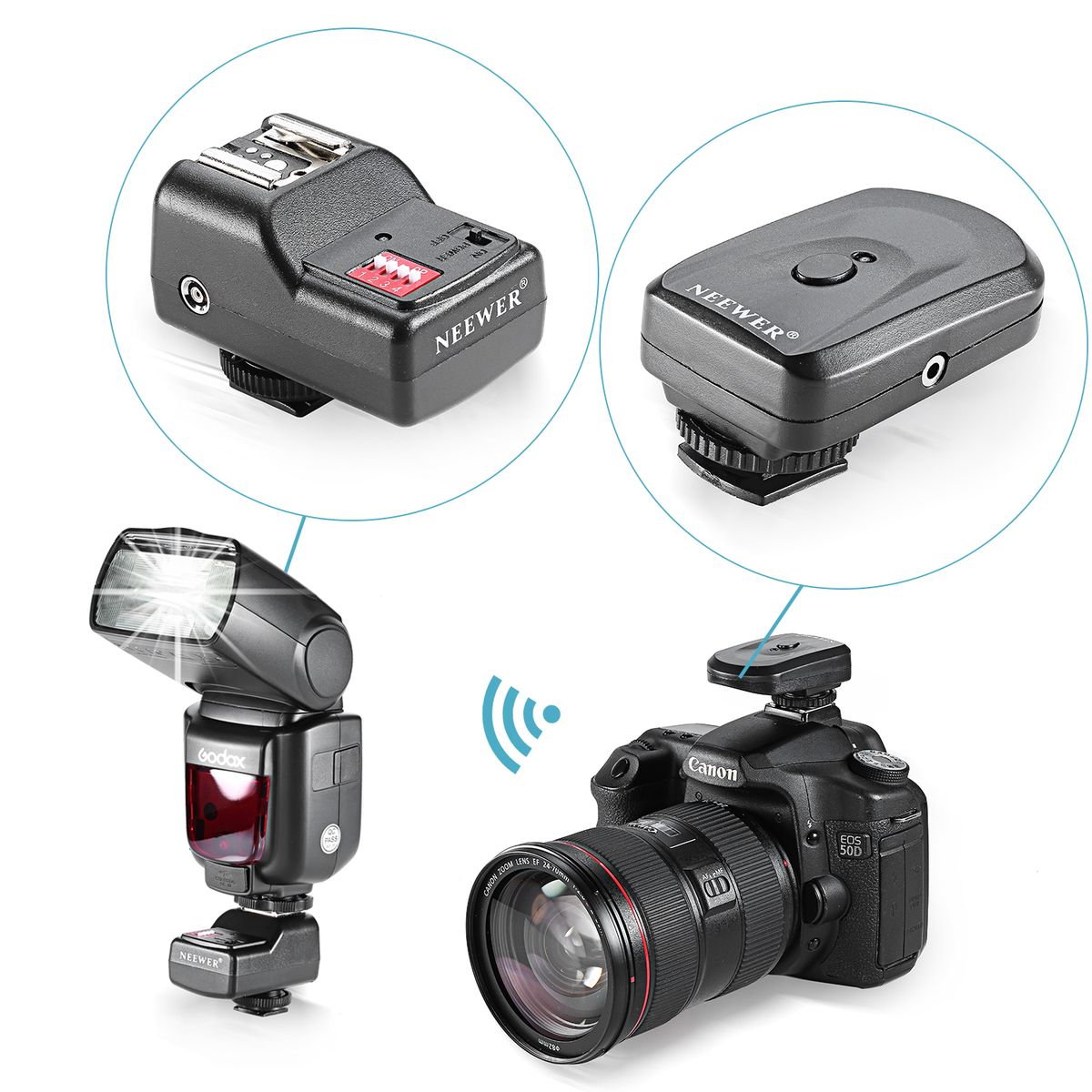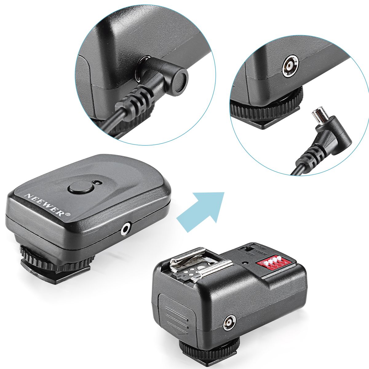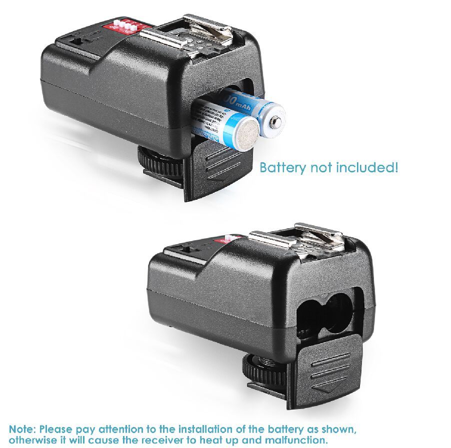 The transmitter is consisting of advanced designed circuit and component,and works through sending encoded signal. It comes with 2.5mm sync port,which permits the camera without hot shoe using this flash trigger