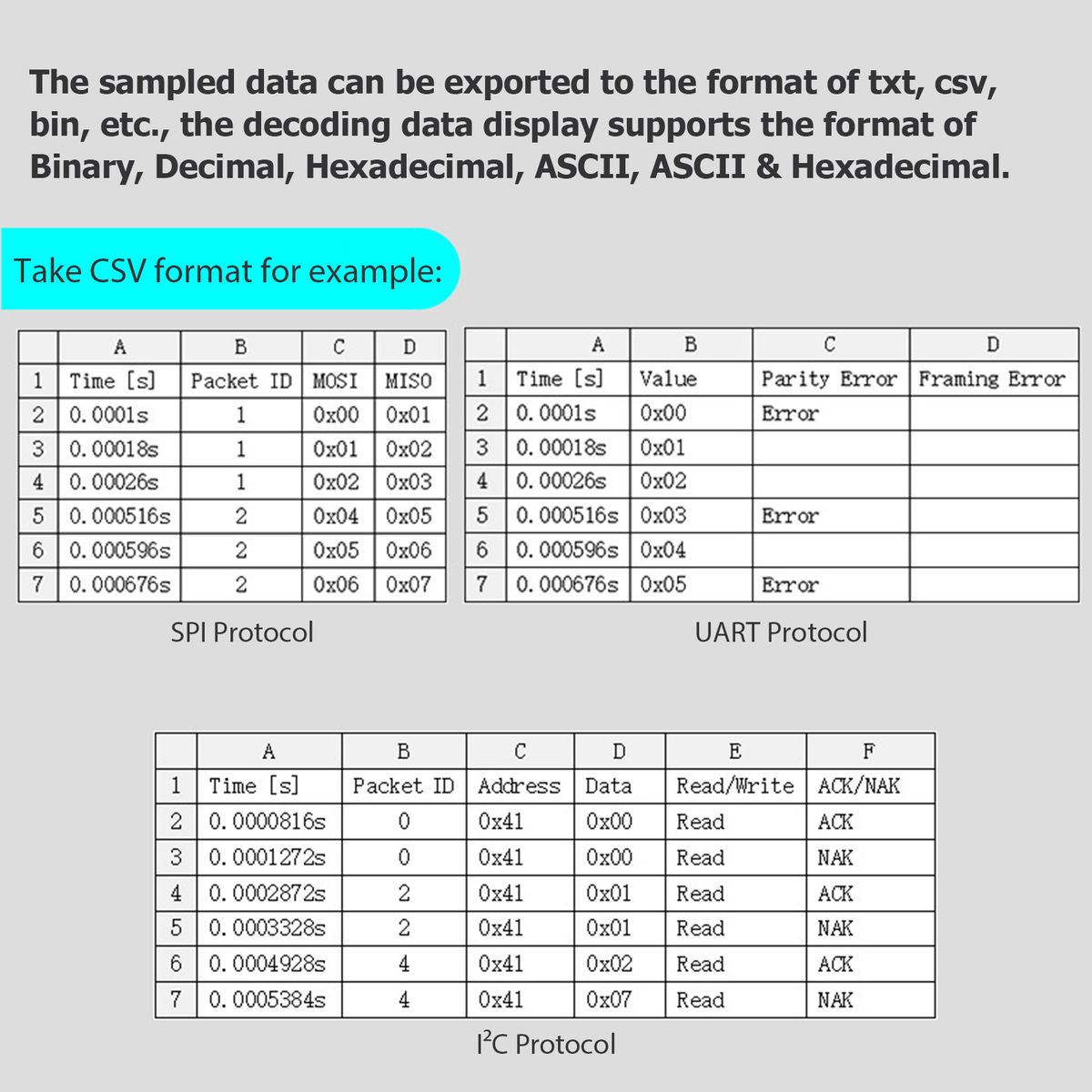 The sampled data can be exported to the format of txt, csv, bin, etc., the decoding data display supports the format of Binary, Decimal, Hexadecimal, ASCII, ASCII & Hexadecimal.