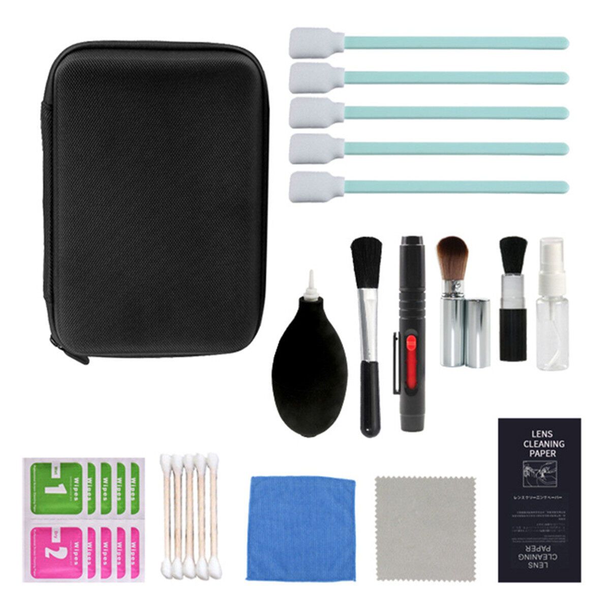 1 x Air Blower Cleaner 1 x Lens Cleaning Pen 1 x Professional Cleaning Brush 2 x Cleaning Cloths 1 x Camera Cleaning Tissue 2 x Beauty Brush 1 x Sprayer(Do not included sensor cleaner) 5 x Cleaning Wipes 6 x Sticker 5 x CCD Cleaning Stick 1 x Case