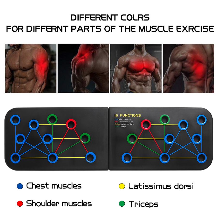 Multifunction Rack Board This Rack Board is a Comprehensive training system that color-coded. Different colors targets different exercise muscle part(Blue-chest, Red-shoulders, Yellow-back, and Green-triceps)