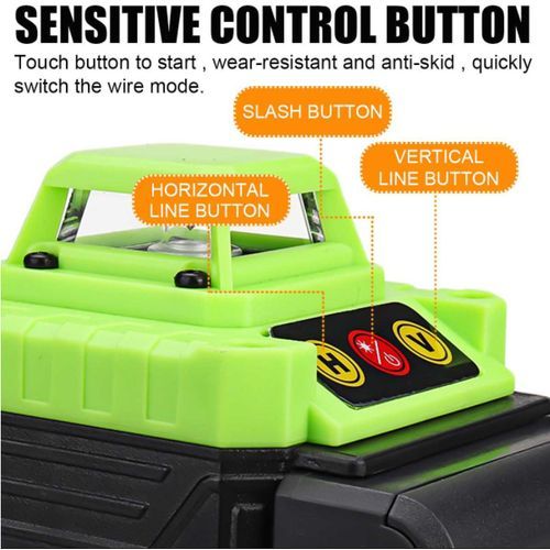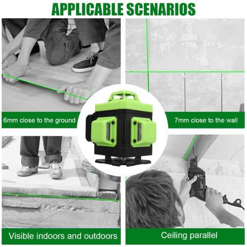 Characteristics:- Accurate measurement and more convenient to use.- 4D 16, 360° line irrigation without dead angle.- Shockproof and shockproof, 4D soft rubber coating, shockproof and shockproof.-± 3° automatic self-leveling function. Audible warning when it exceeds the self-leveling range.-Line 16 can be optional, suitable for different occasions to meet different engineering needs.- International standard IP54 waterproof and dustproof, multiple protection, longer service life in harsh environment.- General indoor and outdoor universal, high brightness green, indoor and outdoor clearly, far throw distance, high laser height, clear lines.- 4800mAh large capacity battery with longer battery life, long life, standby time more than 72 hours, working hours can last 4-8 hours.