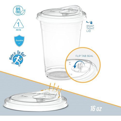 - Eco Friendly plastic PET to go cups are recycable, non toxic, and eliminate the need for straws. Disposable cups are durable and can also be washed and reused. Lid has tight and secure seal to keep cover in place and prevent spills.