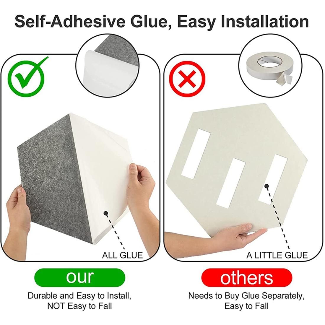 EASY INSTALLATION - The back of the acoustic panels are Self-adhesive, which are convenient for you to install on the wall. Just peel off the back film and stick each panel to your desired position. No special tools or materials needed when intallation. You can simply detach each panel and reinstall to the new desired location with no holes on your walls.